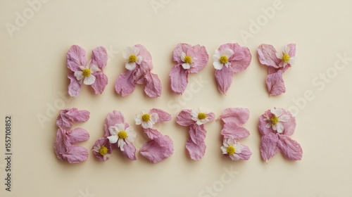 Petals spelling Happy Easter evoke cherry blossom dreamscapes, celebrating Ostara and pink-hued flora fantasia