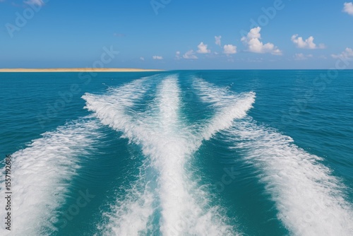 Blurred ocean waves behind a moving boat's stern with a clear blue sky in the background