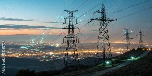 High voltage power lines stretch across the landscape, illuminating a distant city at night, creating a dramatic contrast between urban and rural environments