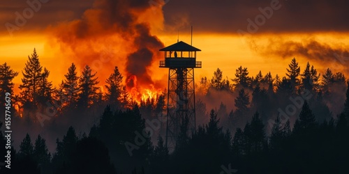 Close-up of a fire lookout tower surrounded by a burning forest. A dramatic image of isolation and danger.