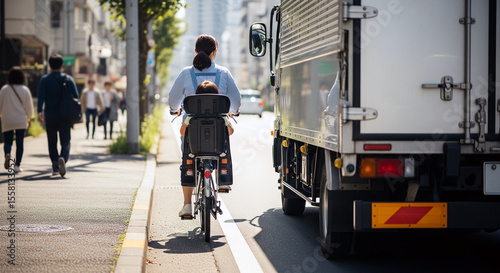 接触の危険性:車道を走る2人乗りの親子 - 自転車・青切符
