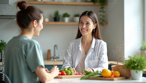 Nutritionist advises client healthy eating in kitchen. Doctor consults young woman about diet, healthy lifestyle. Pro recommends fresh vegetables, fruits. Coaching about proper nutrition, well-being.