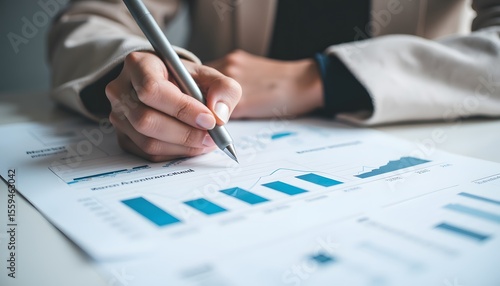 Professional Hand Writing on Business Report with Graphs and Financial Analysis Charts