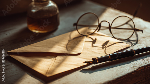 万年筆と眼鏡が添えられた封筒が差し込む光に照らされている。過去の手紙や残された記録を想起させるミステリー向け素材