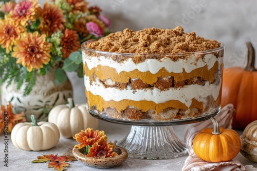 Elegant Autumn Dessert with Pumpkin, Cream, and Crumbled Topping in Glass Bowl Surrounded by Seasonal Decorations and Pumpkins on Rustic Table