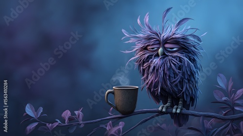 Surreal digital painting capturing a lethargic and irritable owl with unruly feathers, humorously embracing a sluggish Monday with coffee