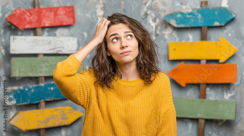 A young woman standing in front of multiple signposts, looking confused and uncertain, searching for direction, outdoors, decision making, dilemma, travel and guidance concept.