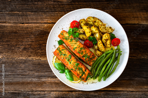Seared salmon steaks with green string beans and roasted potatoes on wooden table