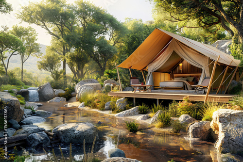 Sustainable Glamping Camp with Luxury Safari Tents Overlooking Watering Hole with Photogenic Wildlife