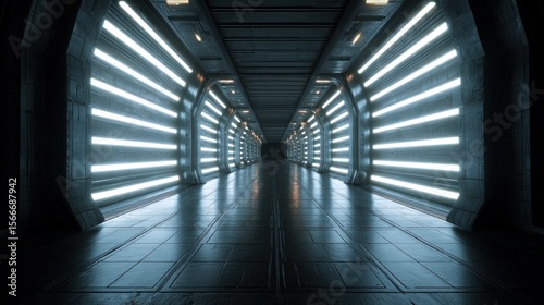 Futuristic metal corridor with bright linear lights abstract sci fi background