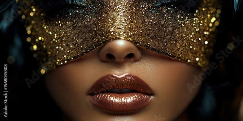 luxurious blindfolded beauty in art deco gold, mysterious woman with blindfold and golden accents, elegant dark portrait in luxury art deco style
