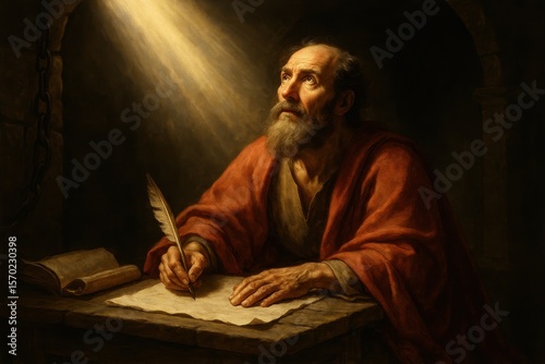 Religious artwork depicting Saint Paul writing epistles in prison with divine light and spiritual symbolism