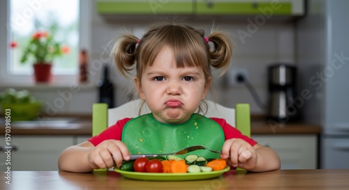 Little girl with pigtails looking displeased at a plate of vegetables at the kitchen table.