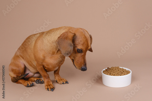 Dachshund peering sadly at bowl of kibble, perfect for concepts like picky eating or dietary issues