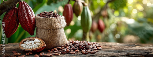 Rich Cocoa Beans and Pods Displayed in a Natural Setting with a Jute Bag Surrounded by Lush Greenery