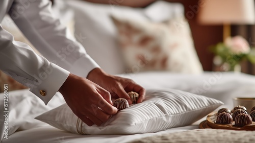 Luxurious hotel room preparation with elegant pillows and gourmet chocolates for the perfect guest experience