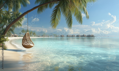 Rajska plaża z krystalicznie czystą, turkusową wodą i białym piaskiem. Na pierwszym planie huśtawka kokonowa zawieszona na palmie, a w tle domki na wodzie.
