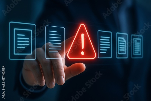 Human finger interacting with a digital interface displaying a warning sign and documents