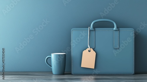 A blue briefcase with a blank brown tag and a matching blue coffee mug sit on a wooden surface against a blue wall, AI HR office activities