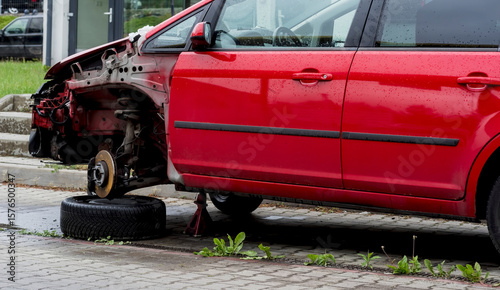 Czerwony samochód bez przedniego koła, oparty o cegłę. Widoczne odsłonięte nadkola i elementy mechaniczne. Samochód stoi na wilgotnej, utwardzonej nawierzchni, z rozproszonymi zielonymi roślinami .