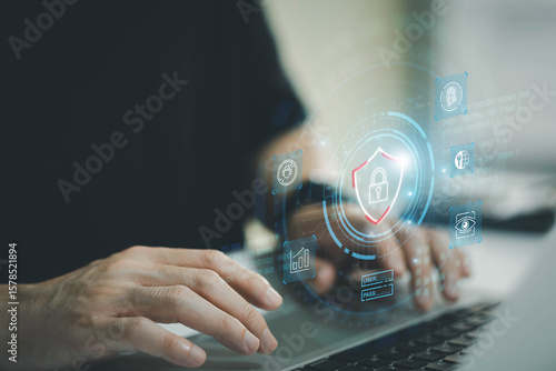Business person secure technology data privacy to prevent cybercrime. Data security or PDPA compliance. Business and financial information data encryption and authentication.