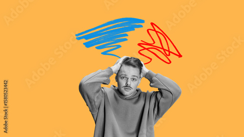 Expressive digital composition of frustrated man with chaotic thoughts in red and blue. Concept of emotional overload, burnout, inner conflict and mental noise in psychological and male contexts.