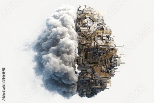 Abstract digital art depicting a brain split between smoke and circuitry.