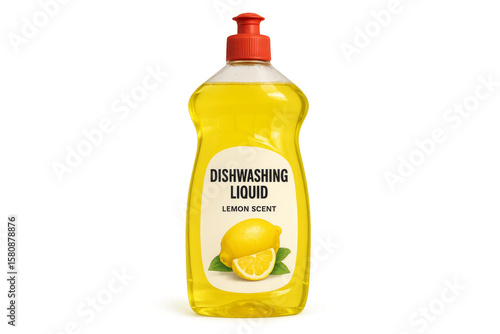 Yellow plastic dishwashing liquid bottle with lemon scent on transparent background