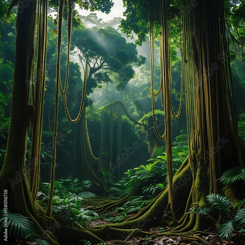 Professional, high-contrast photograph of a dense tropical rainforest with vibrant, emerald green foliage, thick, ropy vines hanging like curtains from towering trees.