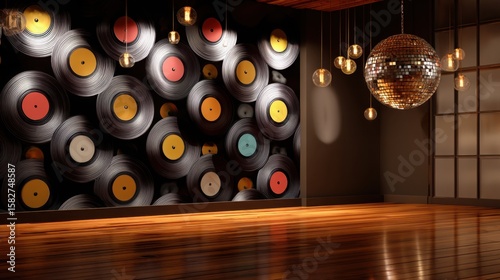 retro style party room interior, 70s disco theme, vinyl records on wall, warm lights, disco ball, wooden floor, minimal and nostalgic