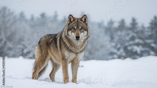 Adult gray wolf standing in a snowy landscape with blurred background trees and a pure white sky during winter season