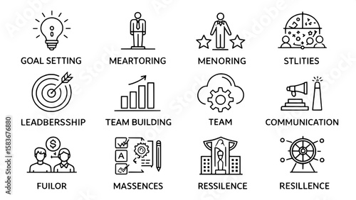 An icon grid depicting various leadership competencies through simple black line art. Features include goal setting, mentoring, team building, clear communication, and resilience. Each icon uses clean