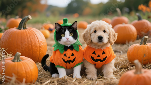 An adorable puppy and kitten in pumpkin costumes sitting together in a rustic pumpkin patch for an autumn Halloween photo