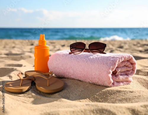 Kolorowy ręcznik rozłożony na złotym piasku. Obok klapki, okulary przeciwsłoneczne i krem z filtrem. Delikatne cienie od słońca, spokojne fale w tle.