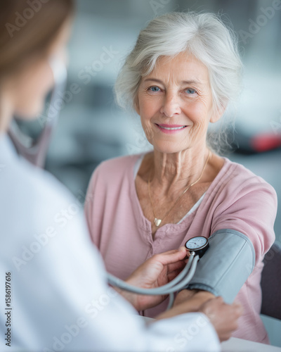 Starsza pani podczas wizyty u lekarza. Lekarz mierzy jej ciśnienie krwi, dbając o zdrowie i komfort pacjentki w przyjaznym, profesjonalnym otoczeniu.
