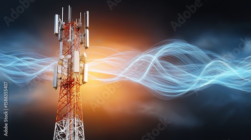 Telecommunication tower glowing with bright blue-orange digital waves, representing data transmission, wireless connectivity, and futuristic telecom energy, Generative AI
