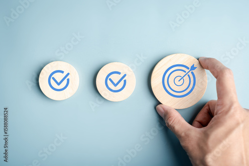 Checklist planning and workflow with target direction, step process, task management, business strategy, goal setting, productivity, and achievement planning.