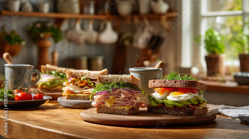 Elegancko podane kanapki na tle stylowej porcelanowej zastawy i filiżanki z herbatą. Subtelna kompozycja idealna na popołudniową przerwę lub angielski podwieczorek.