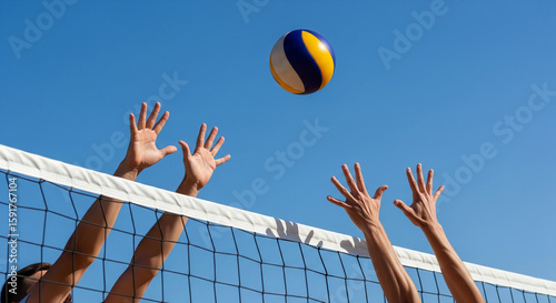 Multiple players' hands reaching to spike or block the ball above the net, perfectly capturing the intensity and teamwork of an outdoor game
