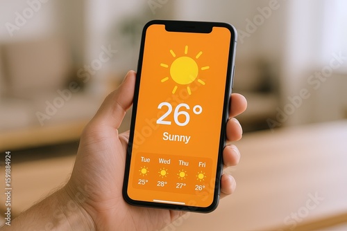 Hand holding smartphone with weather app displaying sunny 26 degrees Celsius and weekly forecast.
