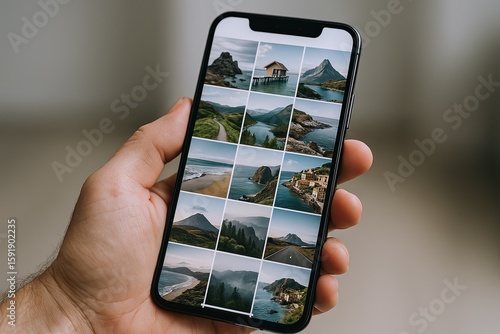 Person Hand Holding Smartphone with Multiple Landscape Photos on Screen.
