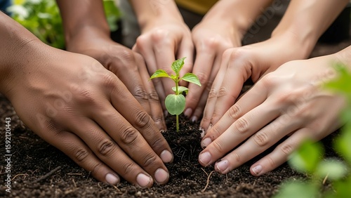 Several hands gently plant a young seedling into fertile soil, reflecting unity, care for the environment, and shared responsibility for a sustainable future.