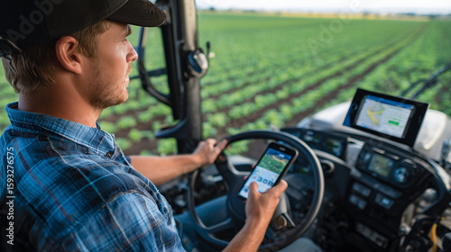 Close-up of a focused young farmer in a tractor cabin, smartphone mounted on the dashboard displaying farm management software. Outside, vibrant fields show signs of careful cultiv