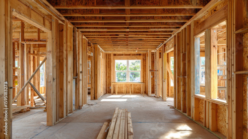 The interior of an unfinished house with wooden frame walls being built, showcasing the construction process and materials used for home building. 3d illustration.