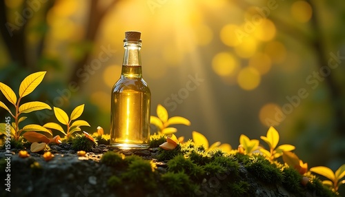 A glass bottle filled with golden liquid sits on mossy rock surrounded by small green plants, bathed in warm sunlight.