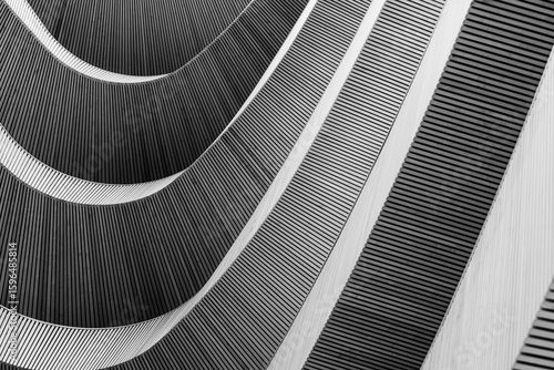 Abstract Architectural Detail of Curved Wooden Slats Creating Modern Rhythmic Patterns in Black and White
