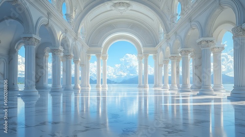 Grand white colonnaded hall overlooking tranquil waters