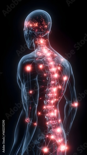Human body with glowing red pain points on neural pathways illustrating pain or nerve stimulation, set against a dark blue background