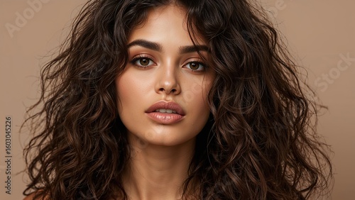 Retrato frontal de una mujer joven y empoderada celebrando la belleza auténtica, con pelo natural y voluminoso y una mirada directa y sincera llena de confianza.