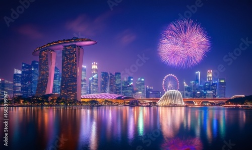 Vibrant fireworks bursting above singapore cityscape, marina bay sands, artscience museum, singapore flyer glimmering against dark waters, night skyline shimmering with light